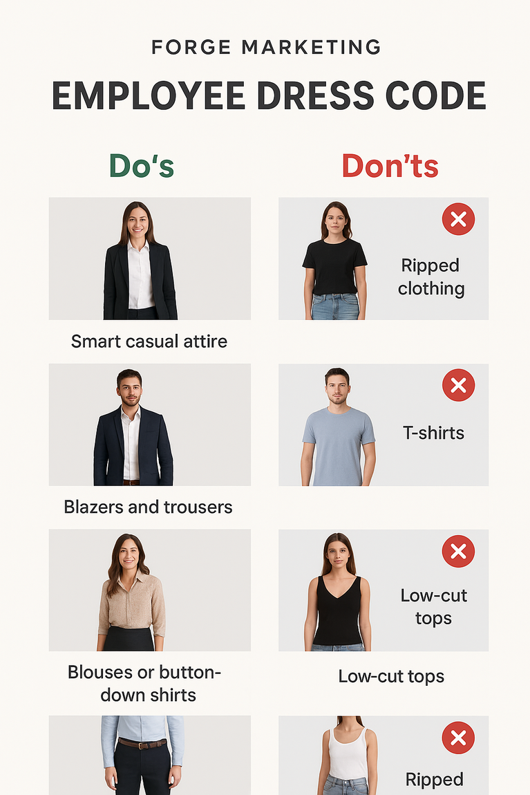 At Forge Marketing, we believe in presenting a professional image while also allowing for personal style and comfort. Our dress code is smart casual for most days, with adjustments depending on meetings, events, or client requirements.